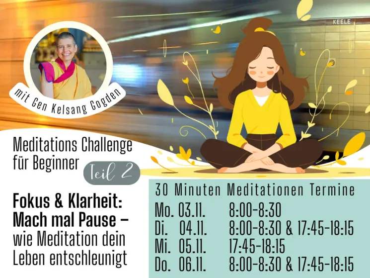Die buddhistische Nonne und Lehrerin Gen Kelsang Gogden leitet einfache Meditationen an, die du danach auch leicht in deinen Alltag integrieren kannst. Erhalte einen (neuen) lmpuls um durch Meditation nachhaltig mehr Entspannung, Leichtigkeit und Frieden in dein Leben zu bringen. Alle, egal welcher Konfession und Lebensausrichtung - sind herzlich willkommen, um Meditation auszuprobieren oder zu vertiefen.